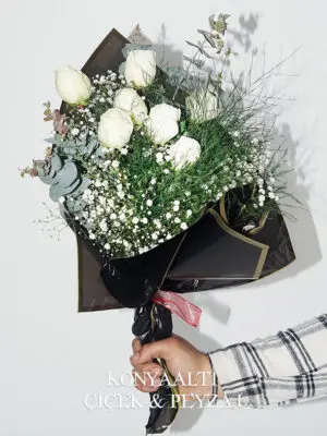 Beyaz Gül Siyah Buket Kağıdı